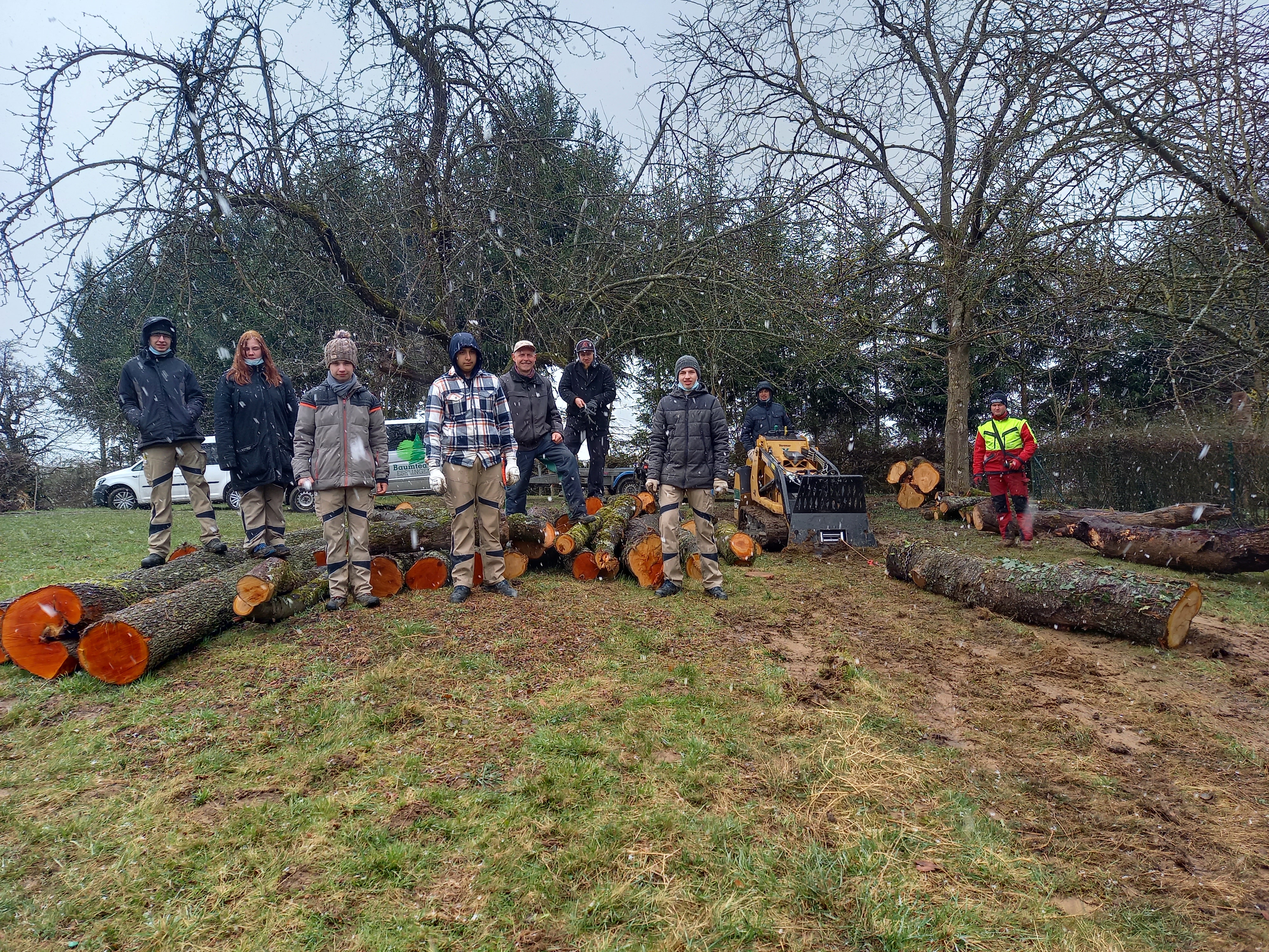 Auszubildende aus dem Beruflichen Ausbildungszentrum Esslingen helfen beim Fällen und Verarbeiten von alten Bäumen und profitieren für die Ausbildung.