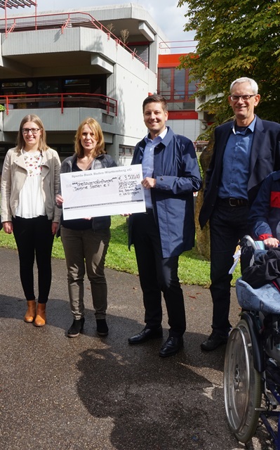 Die Kundenberater Dominik Voss und Sabine Reiber übereichten einen Scheck in Höhe von 3500 Euro an Thomas Illigmann, Leiter des Geschäftsbereiches Kompass der Diakonie Stetten. Der Spendenkontakt kam durch Alexandra Reiber, DHBW Studentin in der Diakonie Stetten zustande.